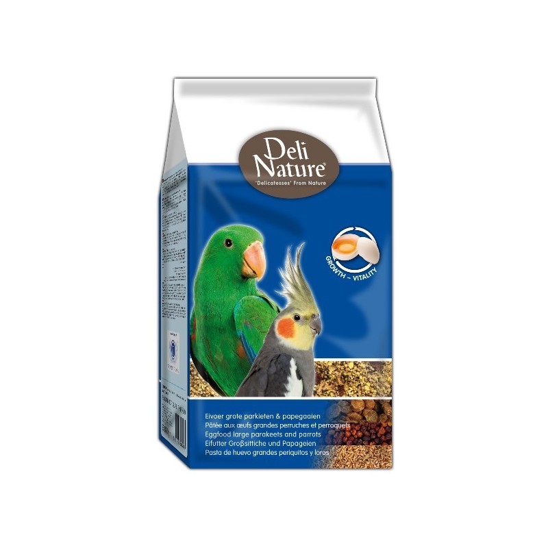 Deli Nature Eivoer grote parkiet en papegaai vet is afgestemd op de behoeftes van jonge en volwassen vogels. Het bevat alle noodzakelijke voedingsstoffen die uw vogels nodig hebben tijdens de rust-, kweek- en ruiperiode. De grove structuur garandeert een volledige opname. De extra toegevoegde zoetwatergarnalen zijn een bron van dierlijke eiwitten. Het eivoer is ideaal voor alle soorten kromsnavels en bevat rozijnen en lijsterbessen. Deli Nature eivoer grote parkiet en papegaai garandeert een optimale groei en ontwikkeling van uw jonge vogels. Het eivoer kan gemengd worden met Deli Nature vruchtenpate TOVO/Insect Pate TOVO om het aandeel fruit en/of insecten nog te verhogen. De extra toevoeging van organische zuren en oregano zorgen voor een optimale werking van het verteringssysteem.