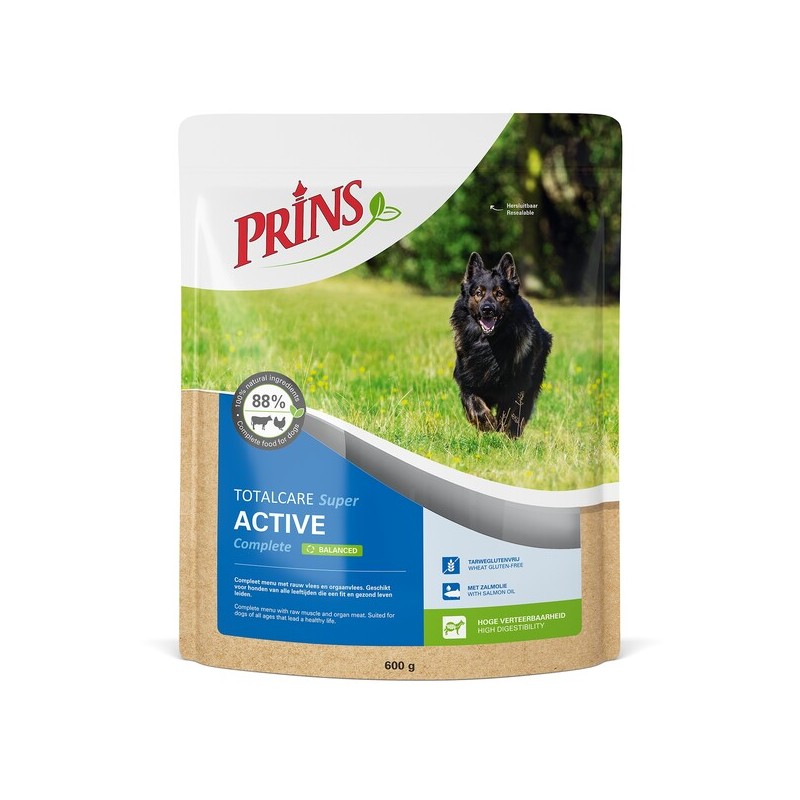 TotalCare SUPER ACTIVE Complete is geschikt voor honden van alle leeftijden. Het vlees op een koele plaats ontdooien. Na het ontdooien twee dagen in de koelkast houdbaar, niet opnieuw invriezen. Serveren op kamertemperatuur. Het vlees kan rauw worden gegeven. Verdere bereiding is niet nodig. Verdeel de dagportie TotalCare SUPER ACTIVE Complete over minimaal twee maaltijden per dag. Geef Prins TotalCare SUPER ACTIVE Complete als hoofdmaaltijd of ter afwisseling op een andere voeding. TotalCare SUPER ACTIVE Complete is uitstekend te gebruiken in combinatie met een brokvoeding, zoals Prins ProCare SUPER ACTIVE of Prins ProCare Croque SUPER Performance. Geef bij voorkeur geen vers vlees en brokken op één dag. Zorg dat er altijd vers drinkwater op kamertemperatuur ter beschikking staat. Overige bijvoeding wordt afgeraden.